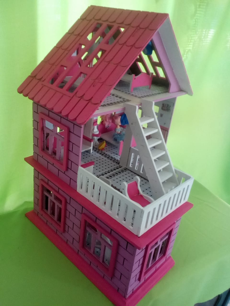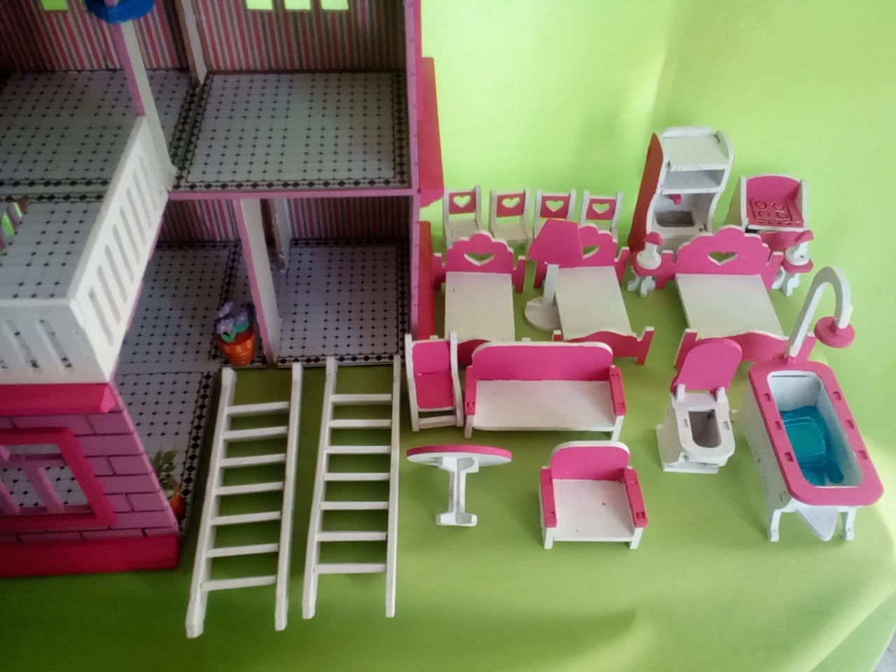 2 escaleras, 3 camas, 1 tina, 1 wc, mesas, sillas, sillones, estufa, etc. todo construido en mdf, interiores tapizados en papel estampado, esteriores con pintura a base de agua.